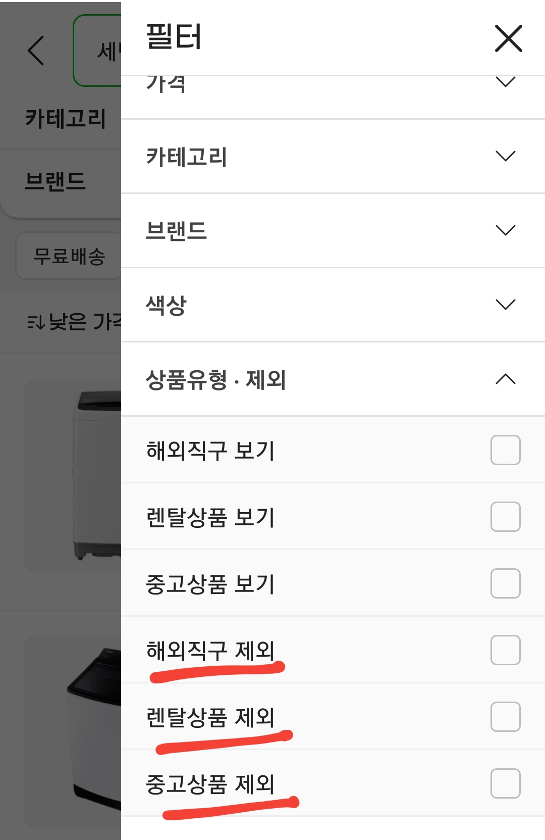 직구, 렌탈, 중고 보기와 제외 필터가 제공됩니다.