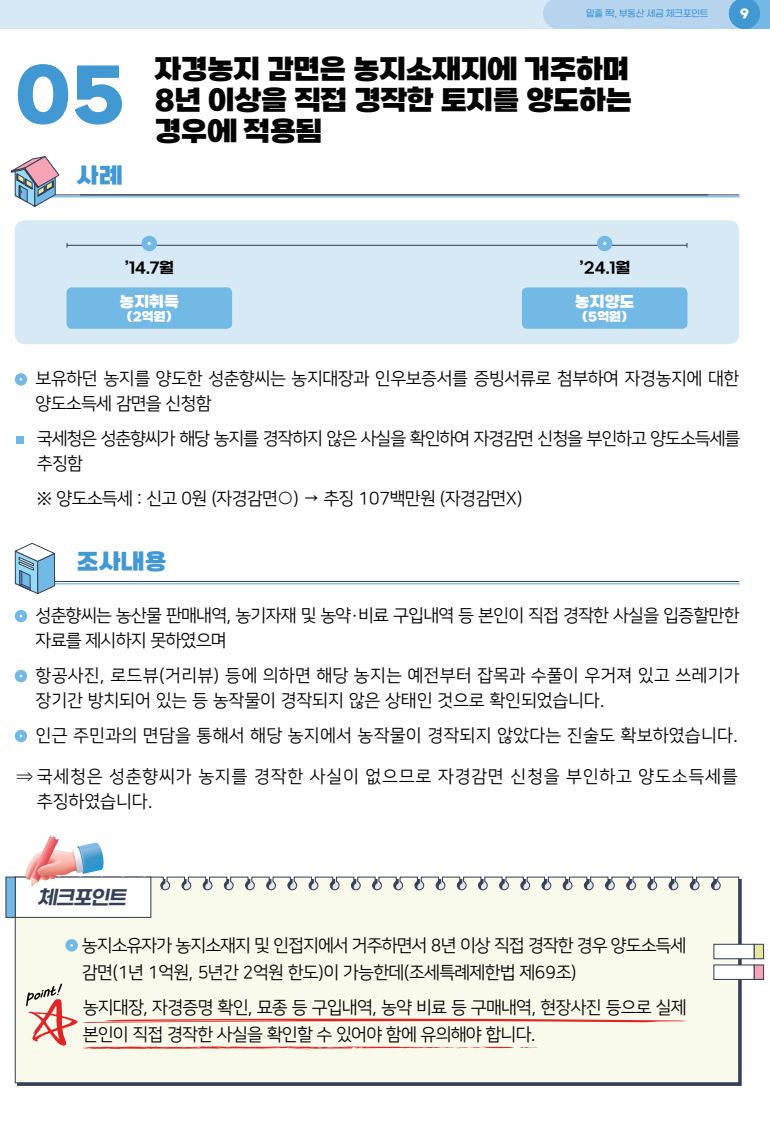 05 자경농지 감면은 농지소재지에 거주하며 8년 이상을 직접 경작한 토지를 양도하는 경우에 적용됨