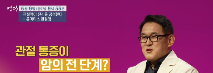 EBS 명의 <관절염이 전신을 공격한다 – 류마티스 관절염> 편에서는 류마티스내과 명의 김완욱 교수, 주지현 교수와 함께 류마티스 관절염에 대해 상세히 알아본다.