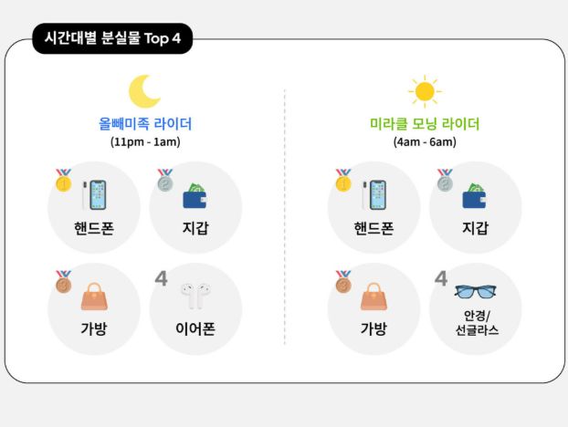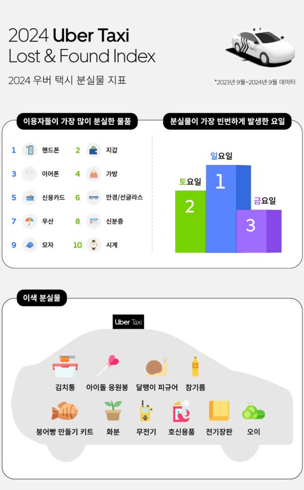 택시 호출 플랫폼 우버 택시(Uber Taxi)가 2023년 9월부터 2024년 9월까지의 분실물 데이터를 분석한 첫 국내 ‘분실물 지표(Lost & Found Index)’를 공개