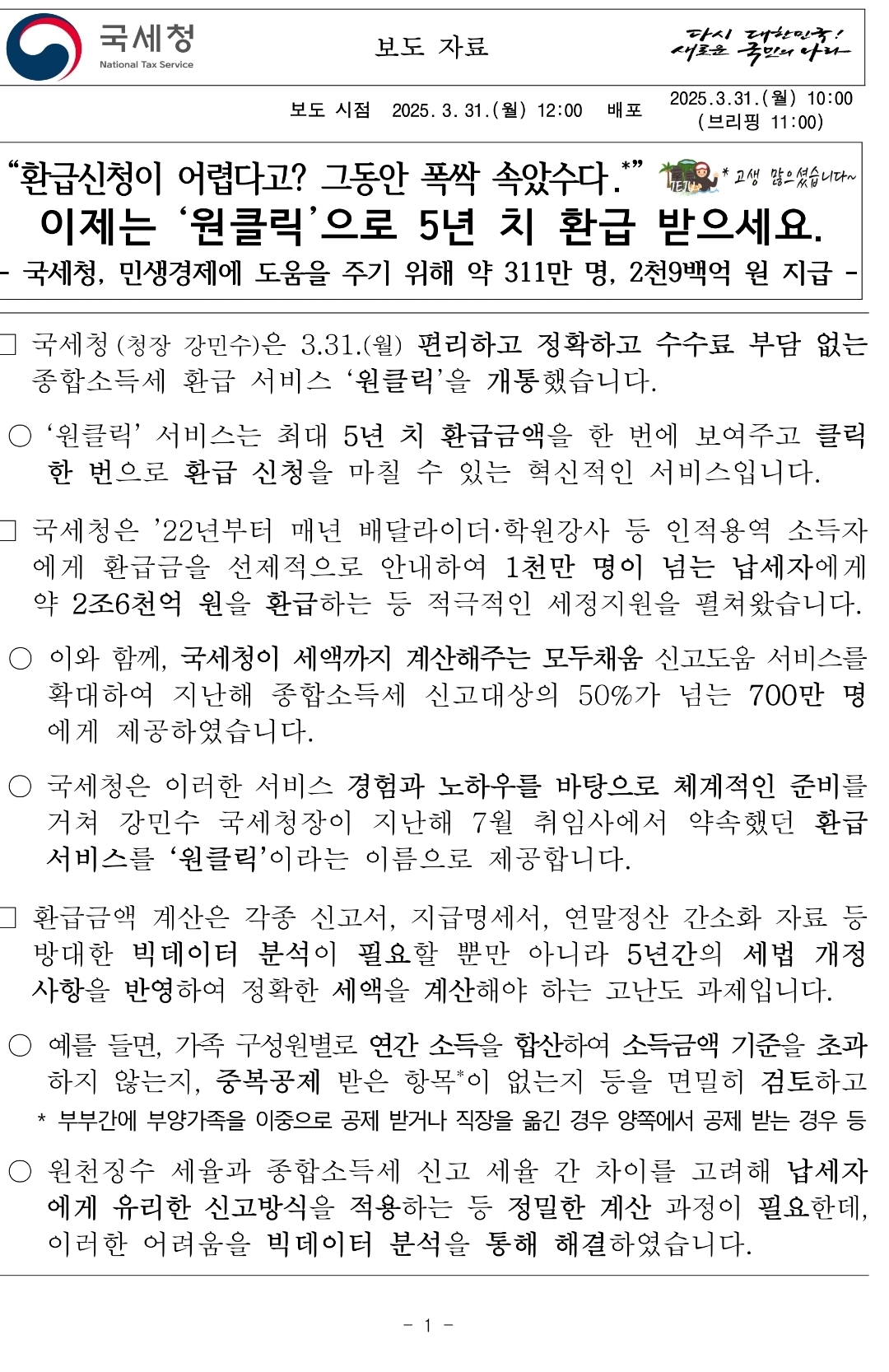 2025.3.31. 국세청 세금환급서비스 (손택스: 원클릭) 보도자료