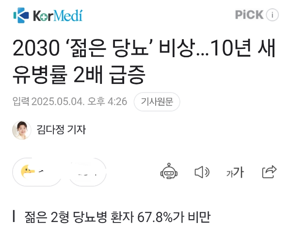2030 젋은 당뇨 비상, 10년 새 유병률 2배 급증.. 젊은2형 당뇨병 환자 67.8%가 비만