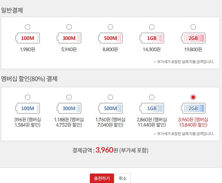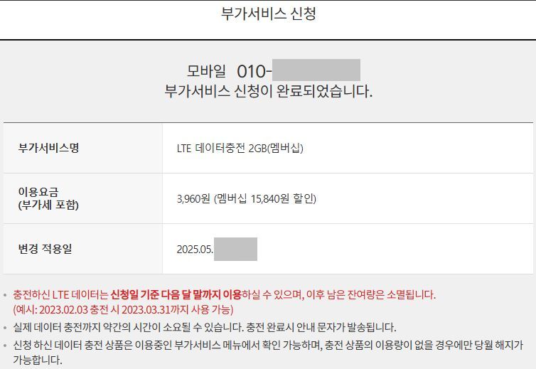 데이터 2기가 충전. 이용요금은 부가세포함 3960원.