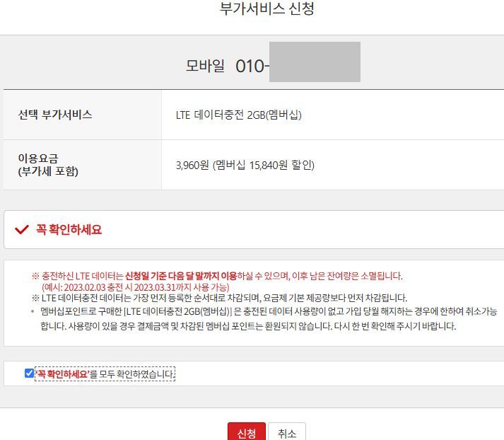본인인증을 따로 받지 않고 바로 신청되고, 요금은 청구서에 합산됩니다.