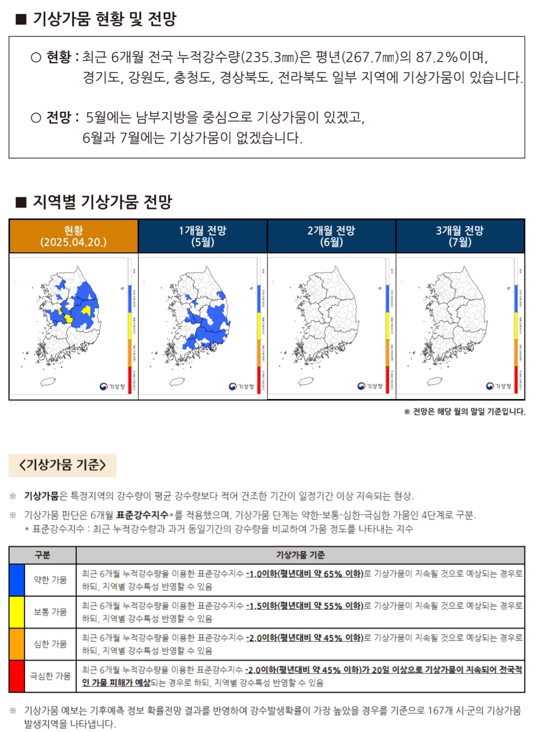 ㅡ 최근 비가 꽤 자주 오는 느낌이 들었지만, 6개월 누적강수량 기록은 평년보다 적었다고 합니다. 그래서 지금 주로 충첯도, 경상도, 강원도 위주로 가문 지역들이 있습니다. 아마도 장마철 전까지같은데, 가뭄은 전라도까지 확대될 전망이라고.