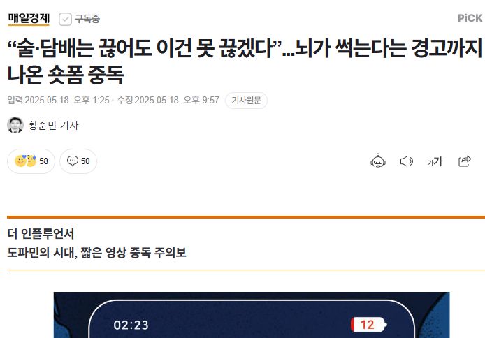 숏폼(영상) 중독 경고 (매일경제신문) 본문
