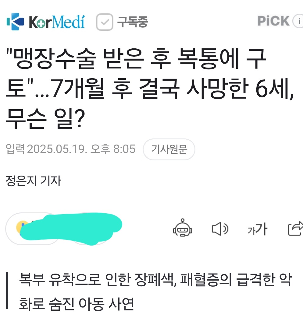 맹장수술 후유증을 앓은 아이가 수술 몇 달 후 사망한 외국 의료사고 (기사) 본문