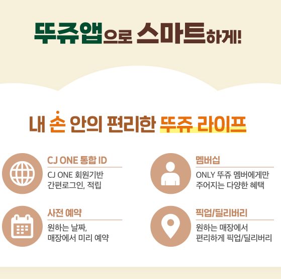 매일매일 더 맛있게, 더 건강히, 더 가까이 내 손 안에 쏙 들어온 뚜레쥬르! 뚜쥬앱이 제공하는 다양한 혜택을 만나보세요.