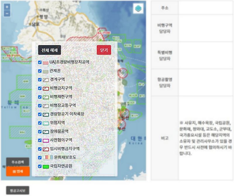 비행승인 필요 주소: 주소가 검색되지 않았습니다. ※ 사유지, 해수욕장, 국립공원, 문화재, 청와대, 교도소, 군부대, 국가중요시설 등은 해당지역의 소유자 및 관리사무소가 있을 경우 반드시