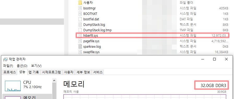 윈도우10의 메모리 용량과 hiberfil.sys 파일의 크기는 꼭 같지는 않습니다 본문