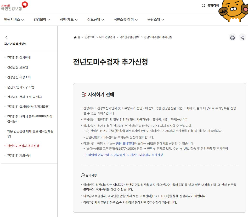 국민건강보험: 국가건강검진/국가암검진 대상조회, 전년도 미수검자 추가신청 등 본문