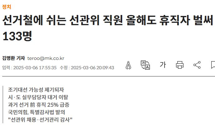 조기대선 가능성 제기되자시·도 실무담당자 대거 이탈과거 선거 前 휴직 25% 급증국민의힘, 특별감사법 발의"선관위 채용·선거관리 감사"