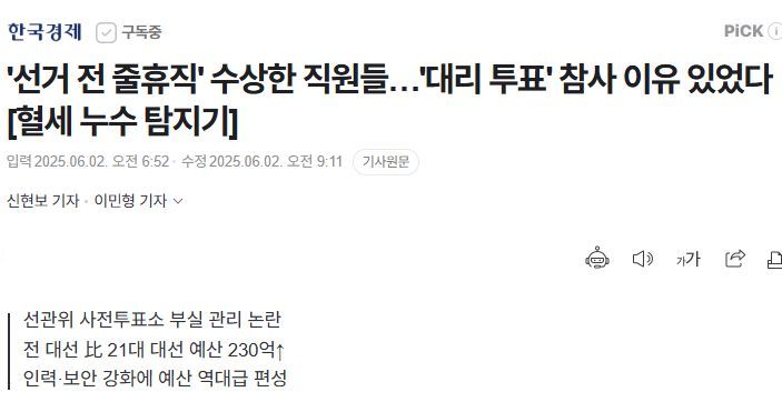 '선거 전 줄휴직' 수상한 직원들…'대리 투표' 참사 이유 있었다 [혈세 누수 탐지기], 선관위 사전투표소 부실 관리 논란 전 대선 比 21대 대선 예산 230억↑ 인력·보안 강화에 예산 역대급 편성