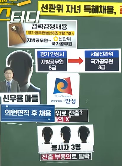 그래서 신우용 아들은 다니던 지자체(안성시)에 의원면적(사표)원을 내 그만둔 다음에 서울선관위의 경력경쟁채용에 응모해 채용됐다. 하지만 경력경쟁채용은 현직 지방공무원을 국가공무원으로 채용하는 것이지, 그만둔 사람을 채용하는 전형이 아니다.
