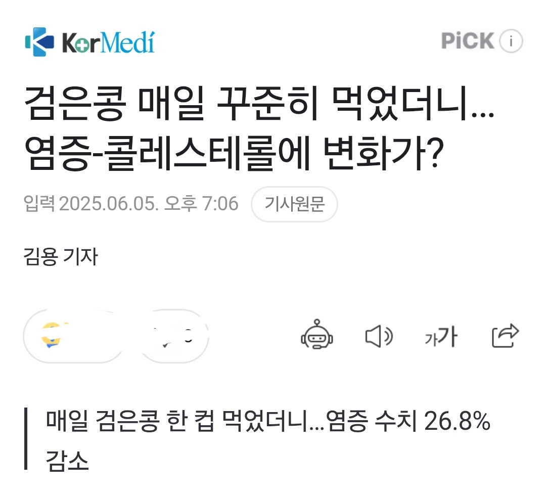 ㅡ "당뇨병 전 단계인 사람이 12주 동안 매일 검은콩 한 컵을 먹었더니 염증 수치가 26.8% 감소했고, 콜레스테롤도 줄었다는 연구 결과가 나왔다. 최근 열린 미국 영양학회 연례 회의 '영양(NUTRITION) 2025′에서 발표"