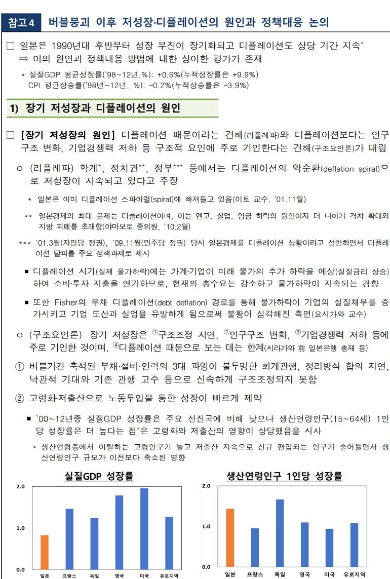 4. 그렇다면 이러한 대내외 경제환경 변화를 돌파할 새로운 성공방정식을 어떻게 찾을 수 있을까? 모든 가능한 정책방안을 궁리해야 하겠으나, 이미 커다란 경제환경 변화를 경험했던 선진경제의 사례를 분석하면서 현실적으로 시행착오를 최소화할 대안을 찾아보는 것이 출발점일 것이다. 이런 측면에서 특히 일본경제는 우리와 여러모로 유사한 면이 많아 그간의 성공은 성공대로, 실패는 실패대로 좋은 시사점을 제공한다. 이에 일본이 1990년 버블붕괴 전후로 경험한 경제환경 변화와 거시정책 차원에서 중 요했던 정책대응을 분석함으로써 교훈을 얻고 우리 경제가 나아가야 할 길을 제시하였다.
