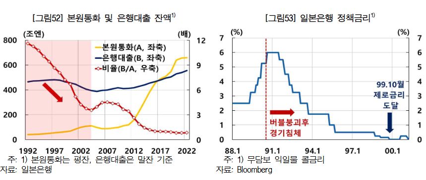 ④ 버블붕괴 전후의 일본은 장기간의 저성장⋅저물가를 낳은 부채⋅인구⋅기술 세 측면에서의 구조변화에 직면해 있었다. 즉 ①자산시장發 부채누증, ②인구고령화, ③글로벌 수평분업화라는 삼각 파고가 중첩된 상황이었다. 물론 일본사회 내에서 이러한 구조변화가 가져올 위기에 대한 경고의 목소리가 없었던 것이 아니나, 이에 대응한 구조개혁은 과거의 성공경험에 대한 기억, 이해당사자의 강한 정치적 반대 등으로 제대로 시행되지 못했다. 이러한 구조적 문제는 구조개혁만이 해결책인데, 보완수단인 경기대응 정책에 상당부분 의존한 결과 ④정부 재정여력은 소진되었으며 ⑤통화정책의 유효성도 오랜 기간 제약받을 수밖에 없었다. 그리고 수십년간의 장기침체를 겪고 나서야 마침내 노동력 확보여성·고령층·외국인, 디지털 전환, 첨단산업반도체 등 재건 등에서 가시적 성과를 내며 재도약을 도모하고 있다.