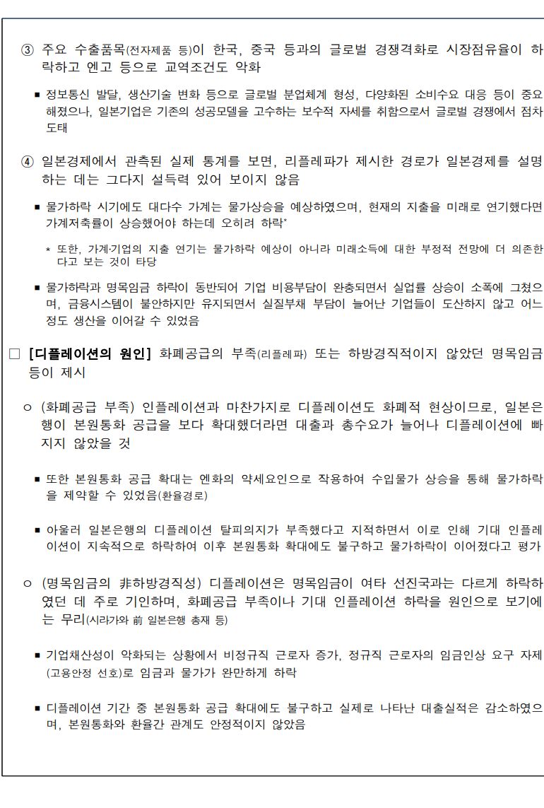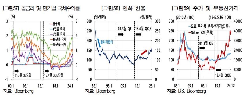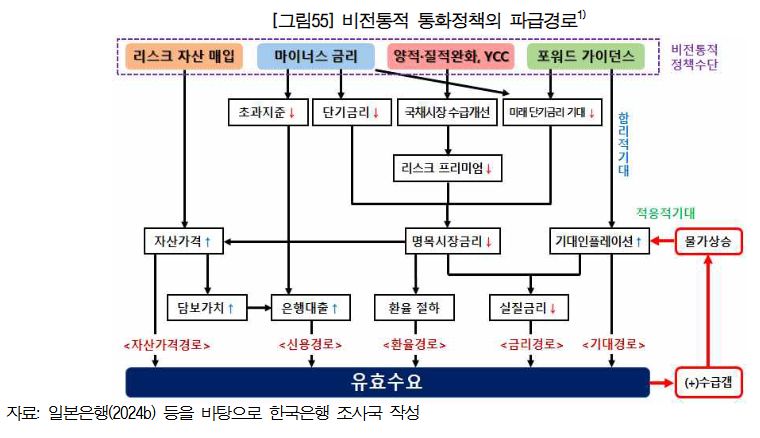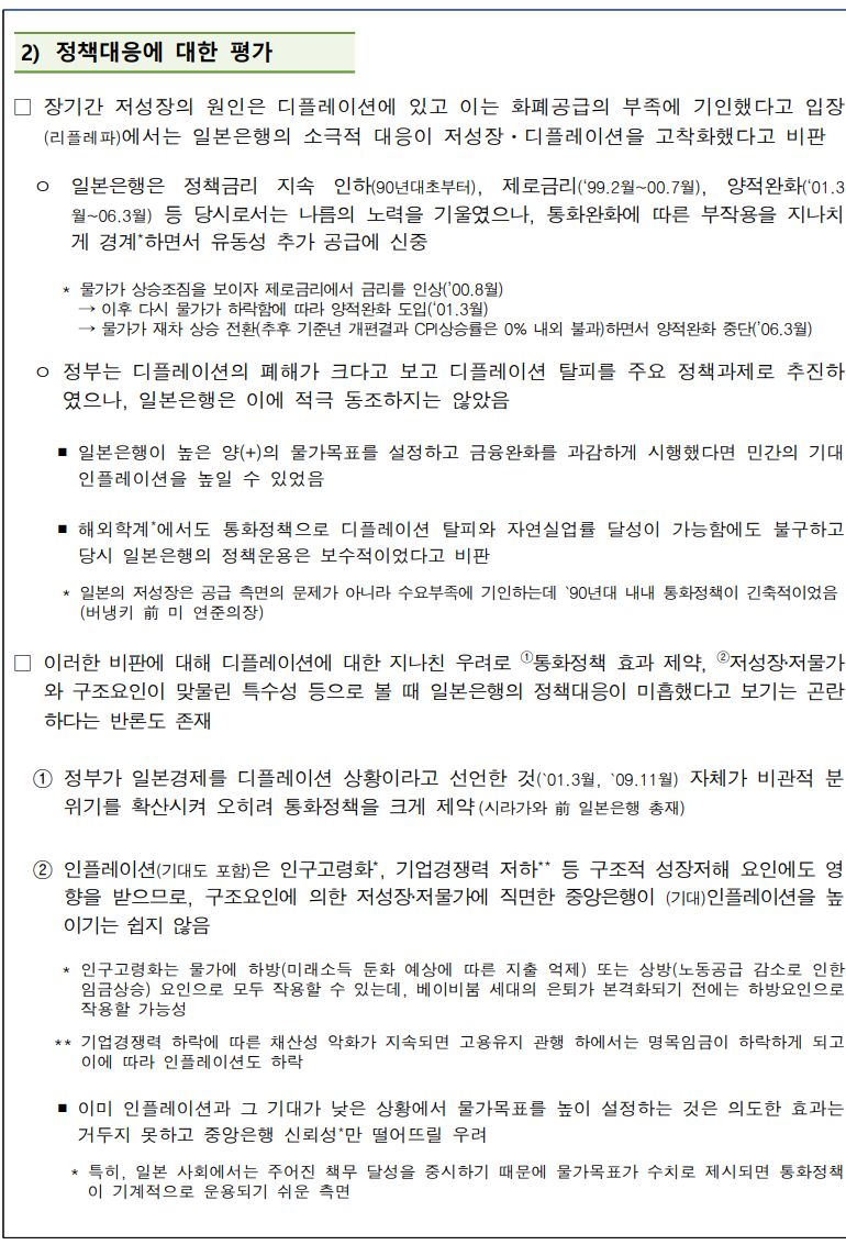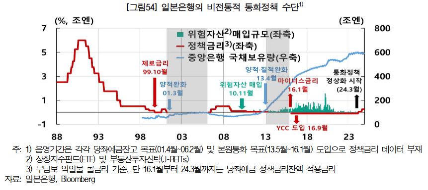 ❺ 전통적이든 비전통적이든 통화정책은 경기대응수단이지 경제체질 개선 수단이 아니다. 잠재성장률 제고는 구조개혁을 통해서만 가능하며, 통화정책은 이를 경기적 측면에서 보완하는 보조적 역할에 그쳐야 한다. 일본은 저성장⋅저물가 를 탈피하기 위해 경제체질 개선 노력보다는 전통적 통화정책이 한계에 다다 르자 각종 비전통적 통화정책양적완화, 위험자산매입, 마이너스금리, 수익률곡선제어 등에 의존하였 던 것으로 판단된다. 2024년 12월 일본은행은 비전통적 통화정책이 단기적 경 기부양효과는 있었으나 성장잠재력을 회복시키지 못하였고 오랜기간 지속되어 부작용금융시장 왜곡 등을 유발하였다고 자평하였다. 향후 우리나라 통화정책 운용 과정에서도 이러한 일본은행의 정책 성과와 부작용을 참고할 필요가 있겠다.