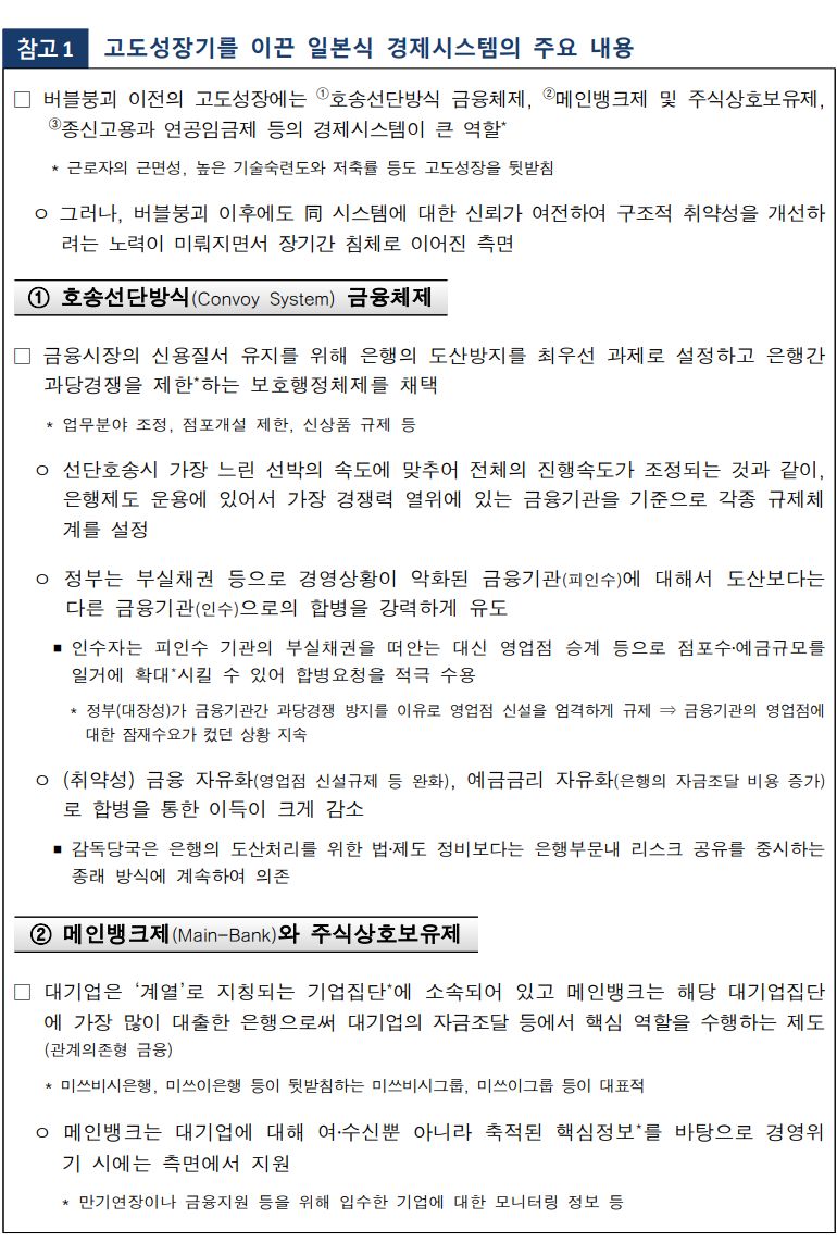 ⑧ 우리 경제는 갈림길에 서 있고, 노르베르그(역사학자)가 「Peak Human」에서 설파한 바와 같이 한 국가의 흥망성쇠는 운명이 아니라 선택의 결과이다. 여러 분야에서 일본의 전철을 밟고 있는 것이 사실이지만, 우리의 미래에 대해 비관적으로만 볼 것은 아니다. 실제로 대내외 여건이 우리에게 양호하였던 적이 거의 없었지만, 우리 경제는 최빈국에서 선진국으로 단기간 도약한 것처럼 저력이 있다. 또 끊임없는 혁신노력으로 제조공정분야에서는 여전히 선두권의 경쟁력이 있으며, K-콘텐츠 등 서비스업종에서도 소프트파워를 키워나가고 있다. 결국 일본의 과거 경험에서 교훈을 얻어 우리 경제수준에 비해 노후화된 경제구조를 혁신(창조적 파괴)해야만이, 우리 경제가 다시 활력을 회복할 수 있을 것이다.