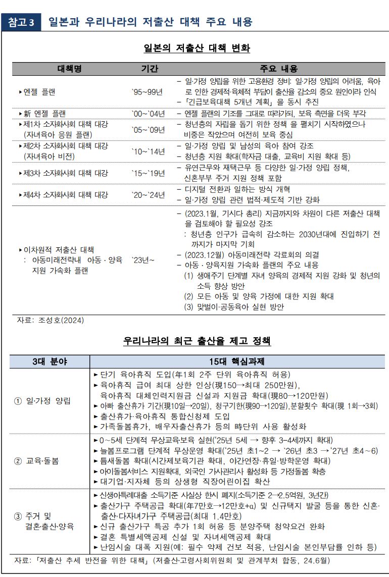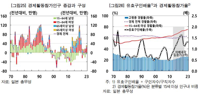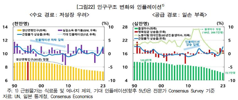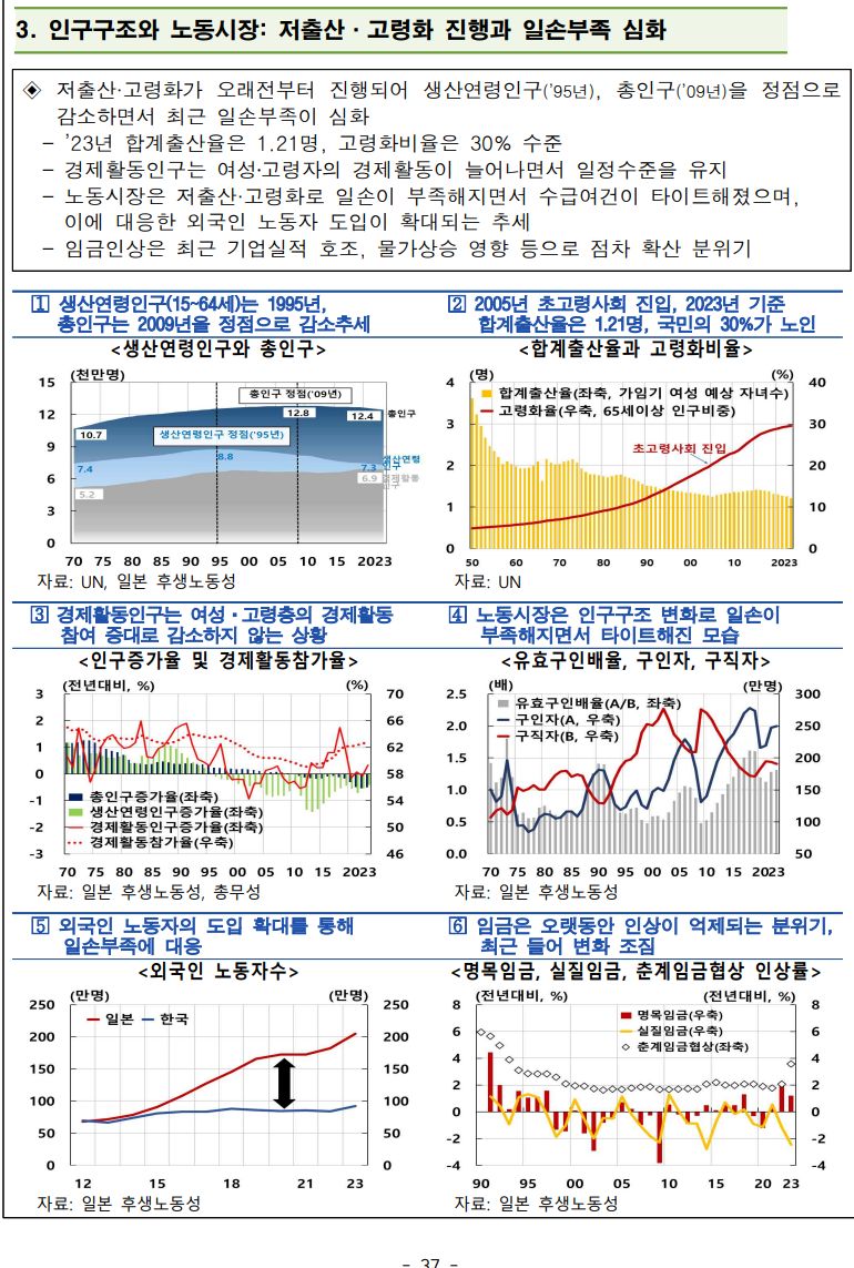 ❷ 저출산·고령화는 일본경제가 결국 장기침체에 들어서게 된 주된 요인이다. 대응이 늦어질수록 큰 비용을 오랫동안 치러야 한다. 일본은 1996년부터 생산연령인구가 감소하였으나, 보수적 관행정규공채 선호, 양육부담 여성편중 등으로 유휴인력의 사회진출이 어려웠다. 그리고 장기침체와 일손부족 2010년대 이후을 겪은 후에야 여성과 고령층, 외국인 노동자를 적극 활용하게 되었다. 우리나라도 생산연령인구17년 정점, UN와 총인구20년 정점가 이미 감소하고 있다. 노동투입의 잠재성장률 기여도는 축소되었으며 취업자수 증가에 인구요인을 더 이상 기대할 수 없게 되었다.