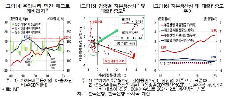 3. 또한 내부적으로는 오래 누적된 구조적 문제들이 표면화되면서 성장잠재력이 약화되고 있다. 저출산․고령화가 여느 선진국보다 빠르게 진행됨에 따라 2018년UN 통계부터 생산연령인구가 감소인구 Bonus ⇒ Onus 시대하였고, 2021년부터 인구 축소사회로 진입 하였다. 그 결과 인구의 잠재성장률 기여도BOK이슈노트 2024-33호는 2000년대 0.7~0.9%p에서 `21년 이후 0.2~0.3%p로 낮아졌다. 이제는 국가 존립의 기본 바탕인 인구가 성장에 부담이 되고 있는 것이다. 또한 부동산으로의 과도한 쏠림과 이에서 파생된 민간부채 누증이 지속되면서 高생산성 분야로의 자원배분이 제약되고 금융불안 리스크도 잠재되어 있다.