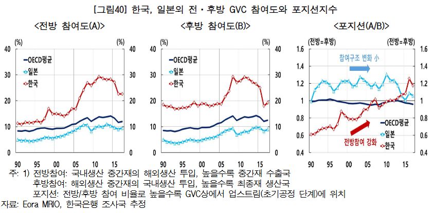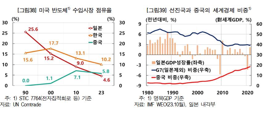 ❸ 한국과 일본은 제조업 중심의 수출 성장모델로 성공하였다. 그러나 과거의 강 력한 성공경험은 이후 국내외 환경이 급격하게 변화하는 와중에서 구조개혁을 추진하는 데 있어 장애물이 되기도 한다. 일본은 수직통합생산으로 선진국미국, 유럽 등에 고품질제품을 수출하면서 성장하였으나, 1990년대 이후 글로벌 수평분업생 산중국중심 GVC형성 등장에 미온적으로 대응한 결과 글로벌 제조업 경쟁에서의 우위 가 약화되었다. 이제 글로벌 통상질서 변화, 중국의 자급률 제고에 따라 우리도 기존 성공전략을 비판적으로 되돌아 볼 시점이다.
