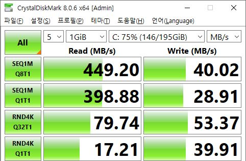 크리스탈마크를 다시 해봤다. 디폴트 설정, 윈도우 10이다.