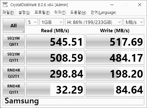 그리고 이 성능이 어느 정도냐 하면, 2013년에 구입한 삼성전자 SSD 840 EVO 250기가가 이 정도였다.