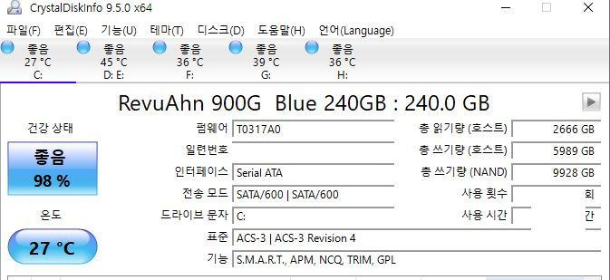RevuAhn 900G Blue 240GB SSD 지금 상태 본문