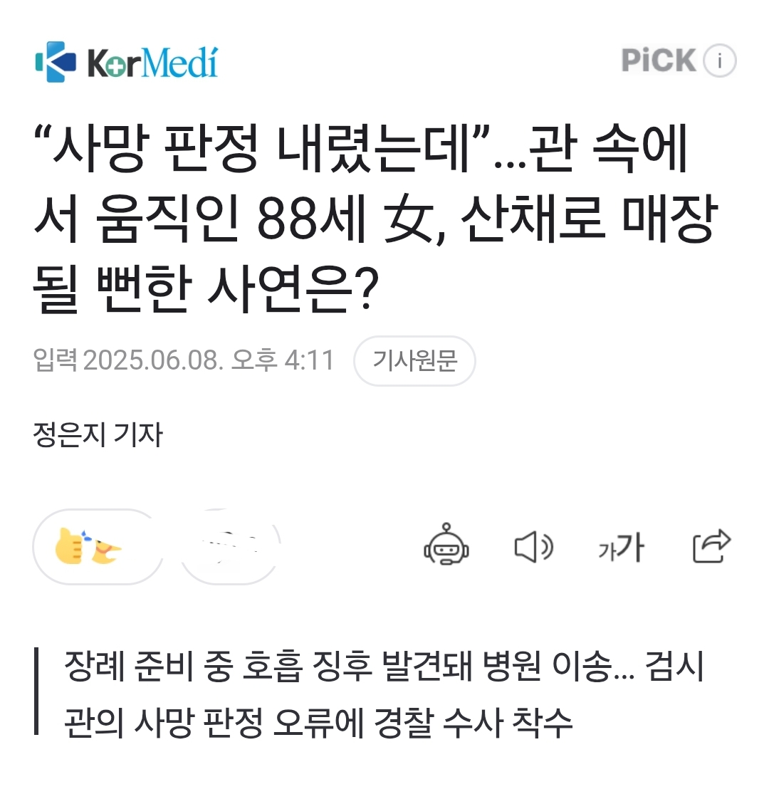 (......) 눈을 뜨거나 숨을 쉬는 등 명백한 생명 징후를 보였고 (......) 병원으로 긴급 이송했으며, 현재 건강 상태는 안정적 (.......) "처음에는 고령 여성의 사망 사건으로 보고 수사를 시작했지만, 생존이 확인된 이후 법적 책임 소재를 포함한 정식 조사를 진행 중"