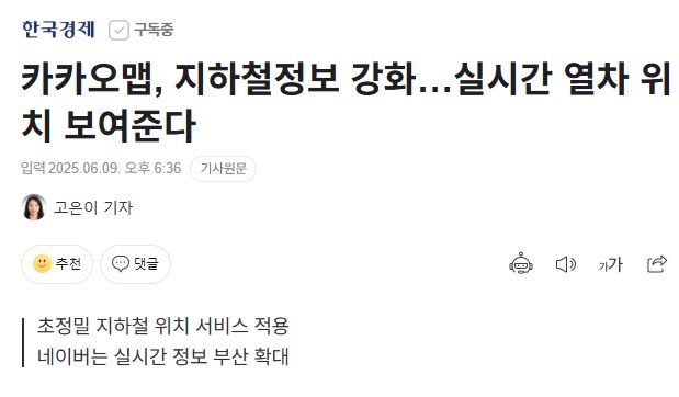 카카오는 카카오맵에 초정밀 지하철 위치 서비스를 적용했다고 9일 발표했다. (......)