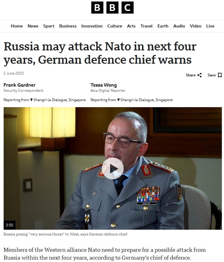 따라서 NATO 회원국들은 군사력을 다시 증강해야 한다고 브로이어 장군은 주장했다. "지금 우리가 해야 할 일은 모두에게 전력을 강화하고, "전력을 증강하세요... 더 강화하세요. 우리에게 필요하니까요. 우리 스스로를 방어하고 억지력을 강화하기 위해서도 필요합니다." (......)
