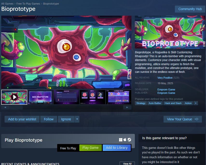 Bioprototype, a Roguelike & Skill Customizing Rhapsody! This is an auto-bomber with programming elements. Customize your character skills with visual programming, utilize enemy organs to finish the mutation, and construct the ultimate prototype, one can su