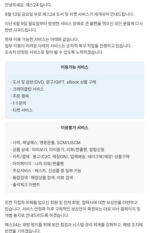 그렇다고 하네요. https://www.yna.co.kr/view/AKR20250610117700017 이틀째 접속 장애 예스24도 해킹당해…"랜섬웨어 공격" | 연합뉴스(서울=연합뉴스) 조성미 기자 = 이틀째 홈페이지와 애플리케이션 접속 장