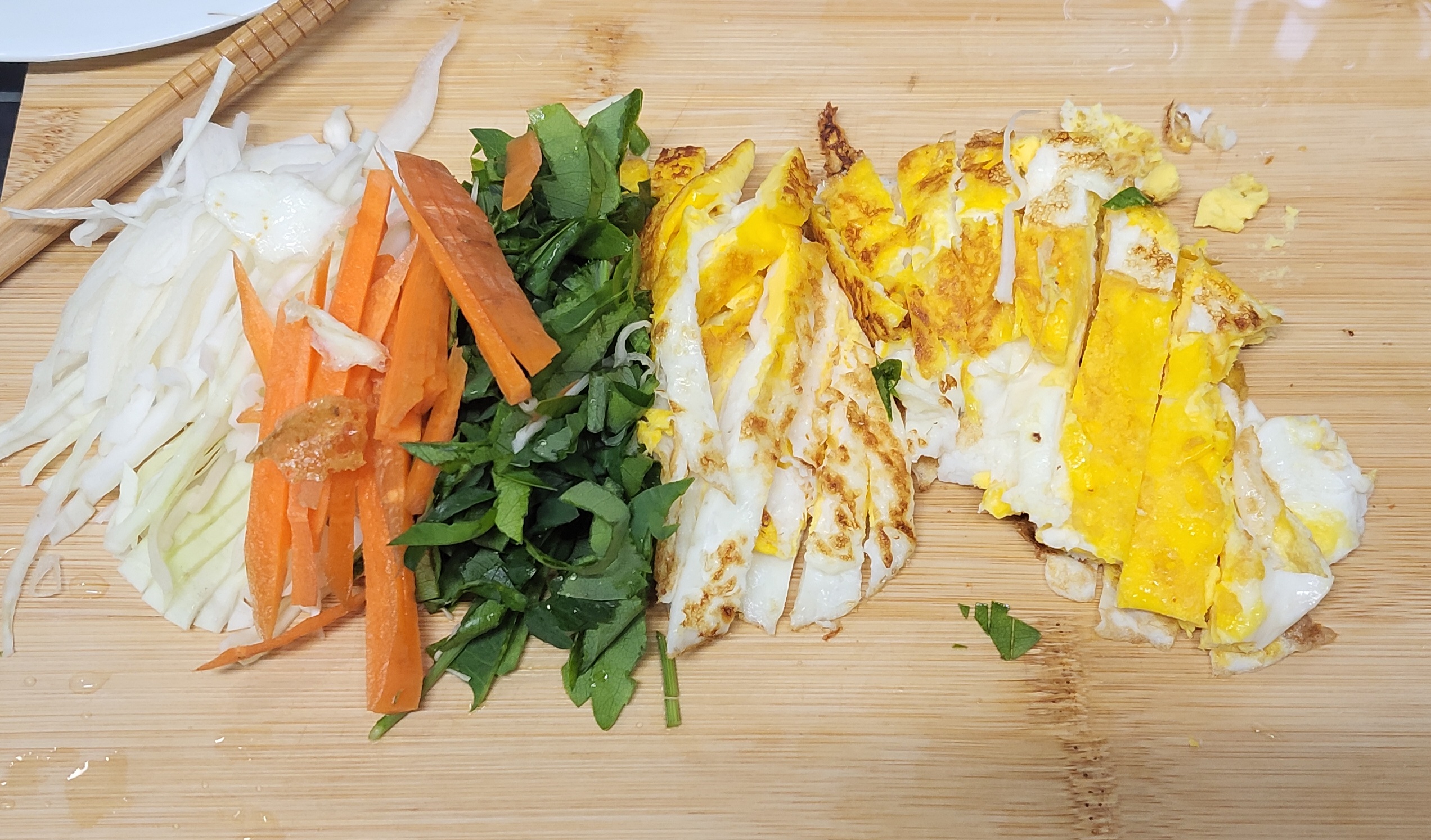 손에 잡히는 채소 약간 + 계란프라이를 국수고명처럼 썬 것.