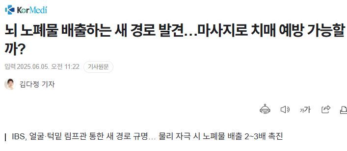 고규영 연구팀은 앞서 2019년과 2024년 네이처에 발표한 연구를 통해 뇌척수액이 뇌 하부 뇌막 림프관과 비인두 림프관망을 거쳐 목 안쪽 림프절로 배출되는 기존 경로를 증명 (......) 노화로 림프관이 퇴화하면 이 배출 기능이 저하 (......) 비인두 림프관과 림프절을 잇는 목 림프관에 약물을 투여해 뇌척수액 배출을 조절할 수 있음이 확인됐지만 이 림프관은 목 깊숙이 위치해 실제 임상 적용은 어려워 (......) 새로 발견된 경로가 기존 경로보다 접근하기 쉬운 위치에 있다는 것이다. 목 깊숙한 곳의 림프관과 달리 얼굴 피부 아래 림프관은 외부에서 직접 자극을 가할 수 있어 활용 가능성이 높다. - 코메디닷컴