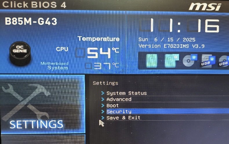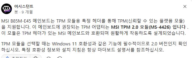 MSI B85M-G43은 지금 BIOS에선 TPM관련 메뉴가 안 보인다.
