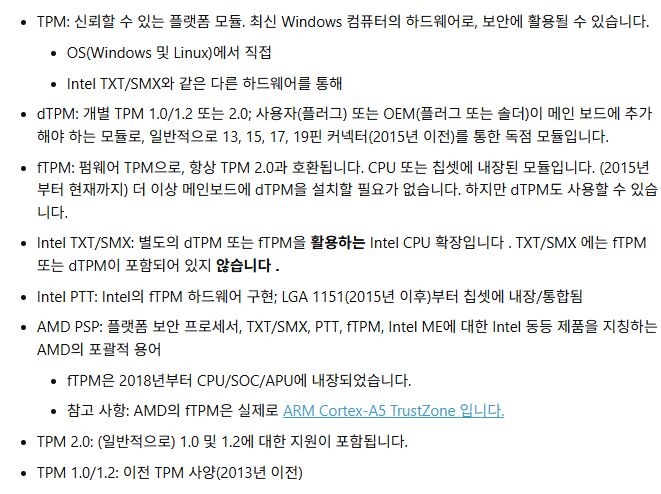 TPM2.0지원 바이오스가 팔요하다. 미리 확인하러..