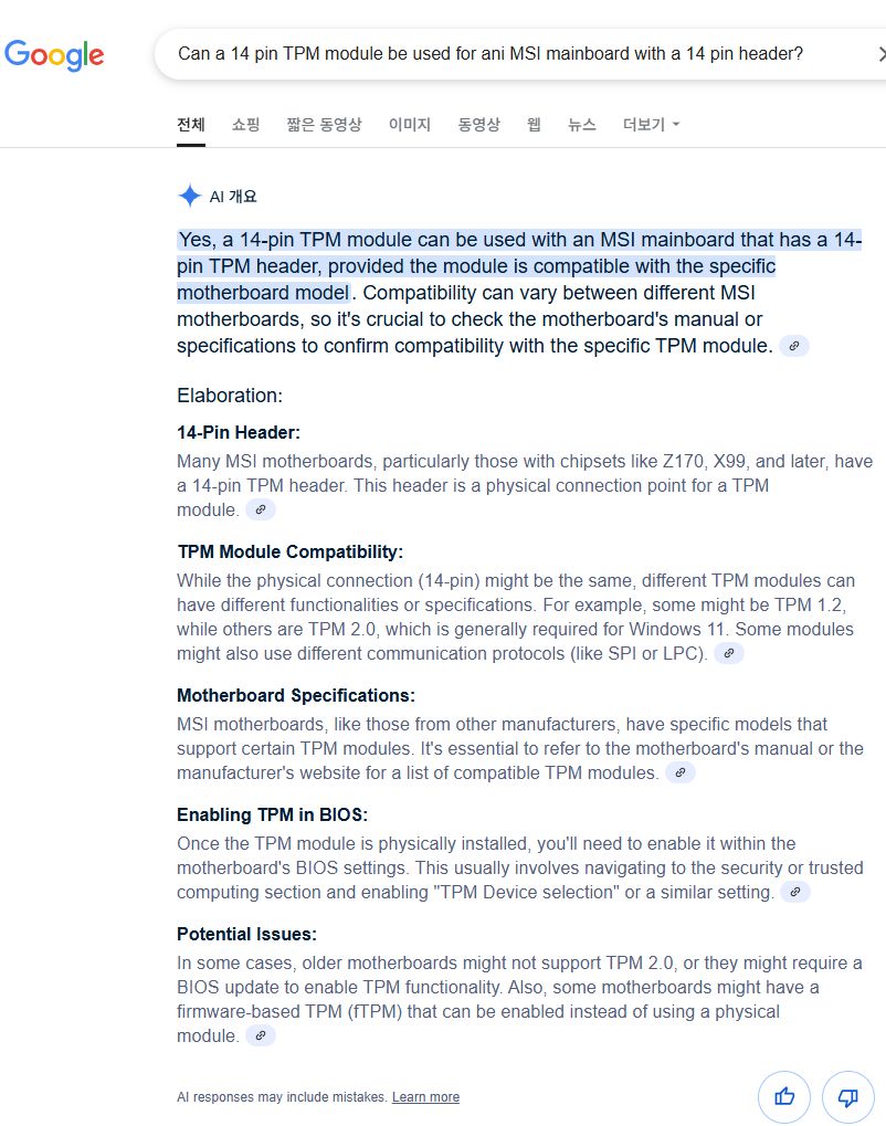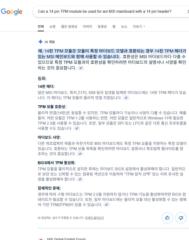 구글 검색에게 물어보기: Can a 14 pin TPM module be used for ani MSI mainboard with a 14 pin header?