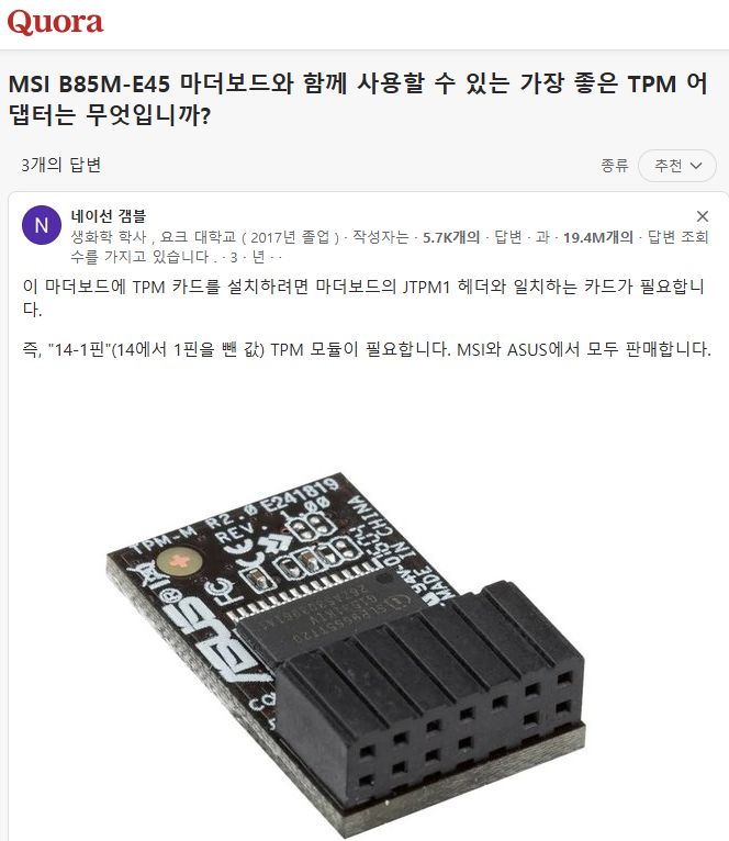 인텔 B85 칩셋 메인보드에 TPM 2.0 모듈을 설치시도한 사례 (링크), 그 외 몇 가지 찾아본 것 본문