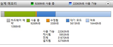 리소스 모니터상에는 여유메모리가 충분하다.
