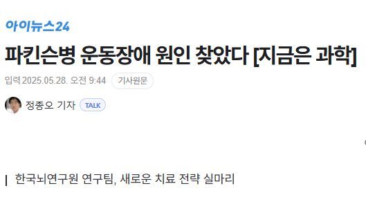 ㅡ 한국뇌연구원은 감각·운동시스템 연구그룹의 라종철 책임연구원 연구팀이 파킨슨병의 운동장애가 뇌 속에 있는 ‘행동억제 신경회로’의 과활성화와 관련이 있다는 사실을 규명 (......) Modulation of premotor cortex excitability mitigates the behavioral and electrophysiological abnormalities in a Parkinson's disease mouse model 라는 이름으로 국제학술지 ‘Progress in Neurobiology’ 6월 최신호에 게재.