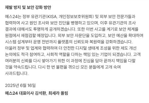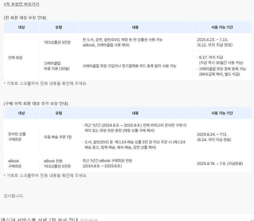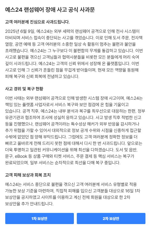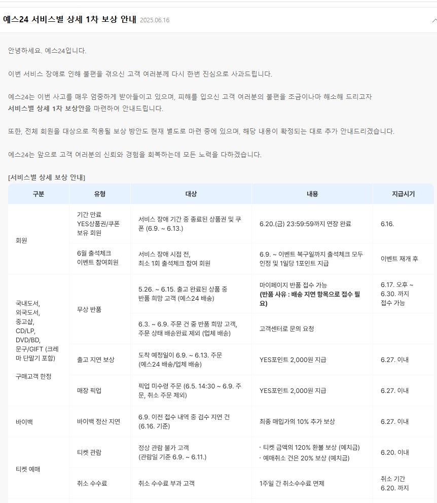 Yes24.com 해킹관련 공지, 보상안 등 본문