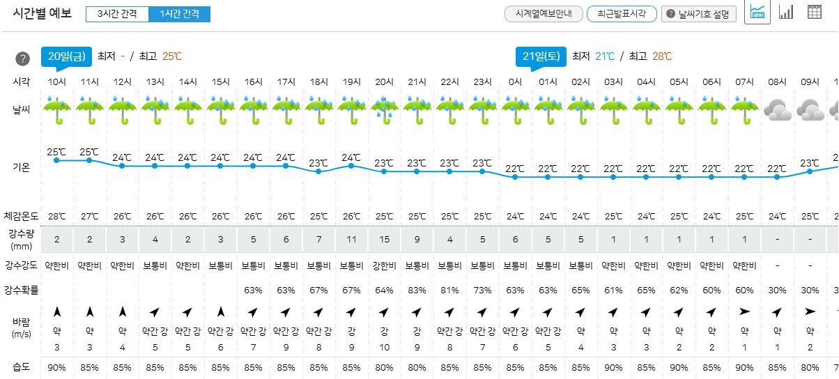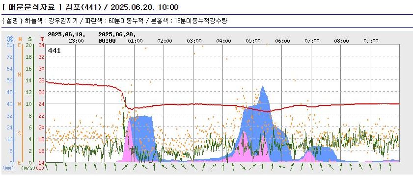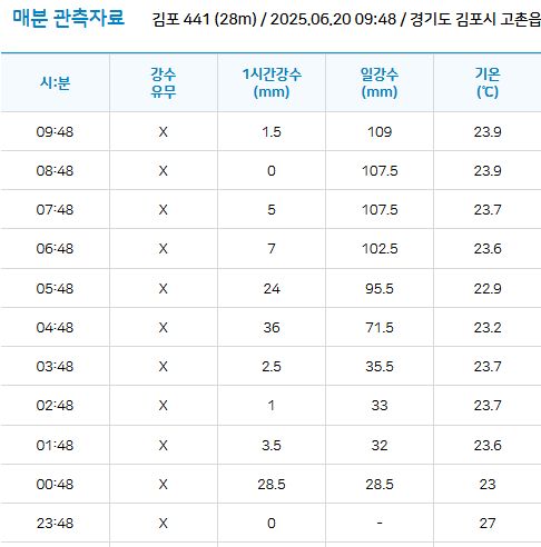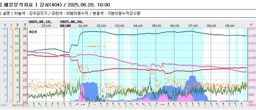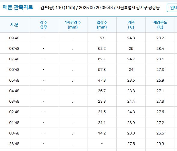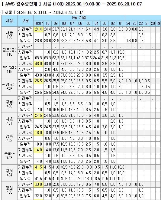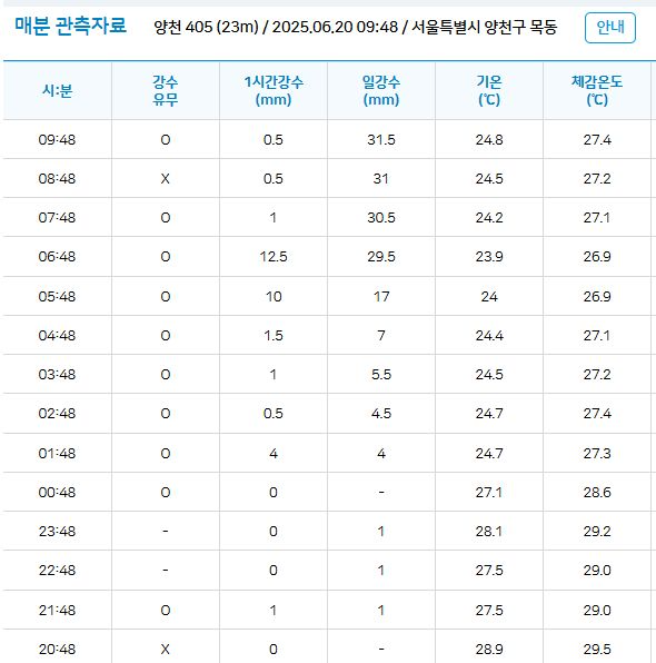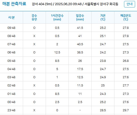 서울에서는 서해바다에 가깝고 호우경보가 내린 경기도 김포 바로 옆인 강서, 양천지역을 보았습니다. 다른 지역도 링크따라가서 보면 기록을 확인할 수 있습니다.