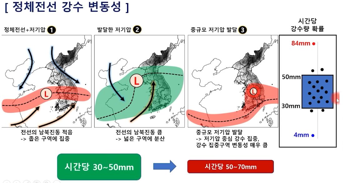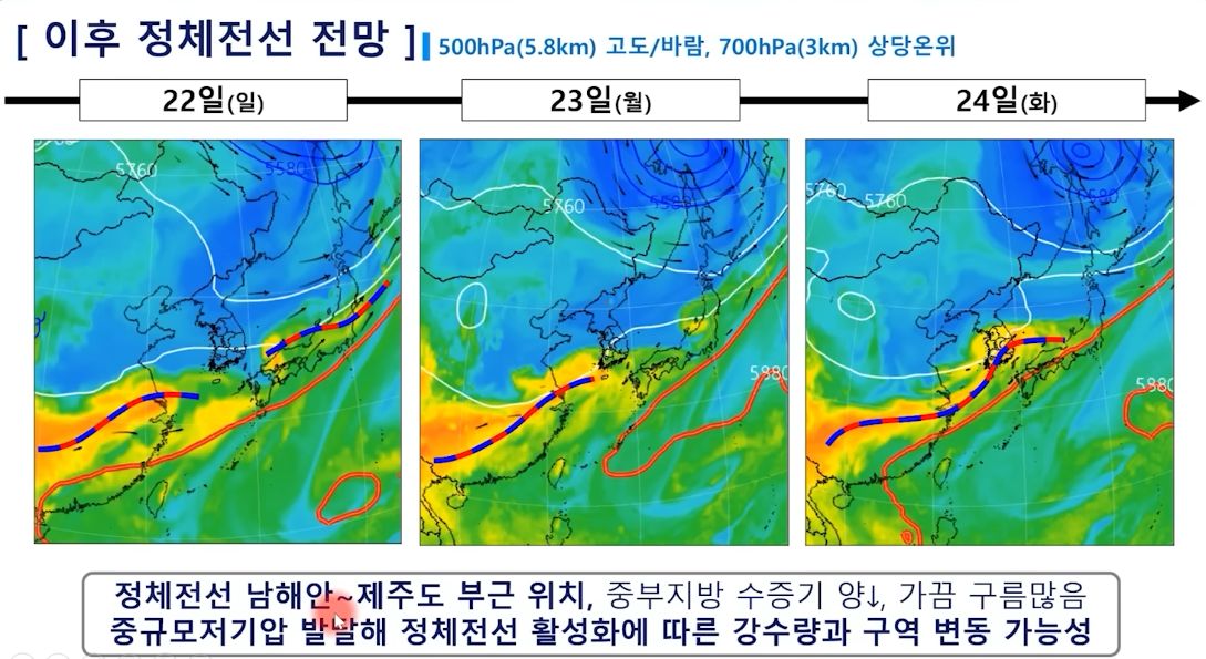 하지만 이 장마전선/정체전선은 아래 주간예보에도 나오듯이 남해에 걸쳐서 "정체"하기 때문에,