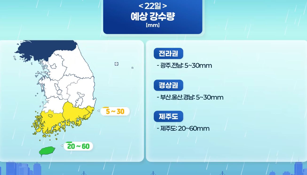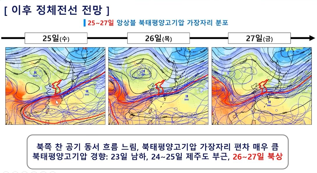 22~24일 쯤에는 정체전선이 제주도까지 내려가서 남해에 비를 내린다는 모양입니다.