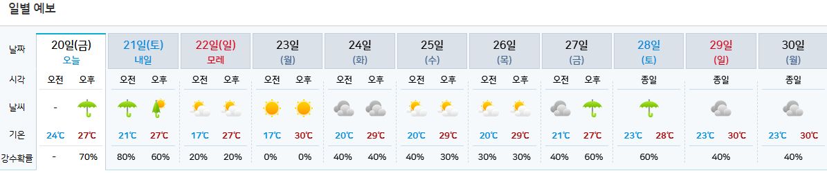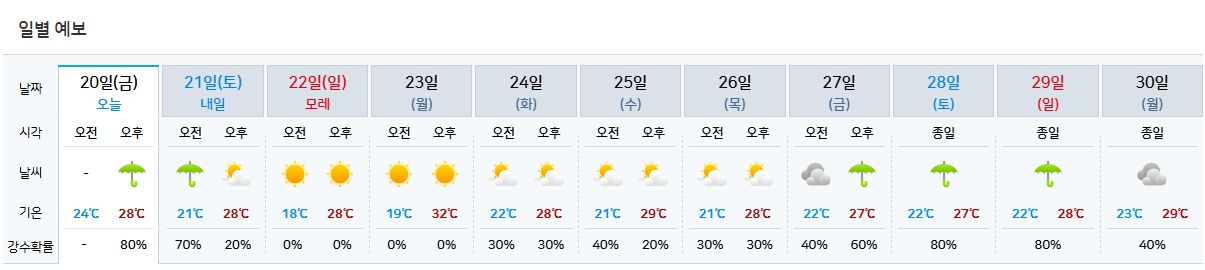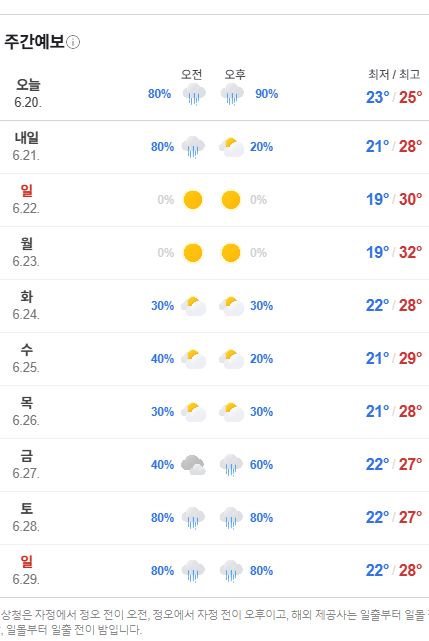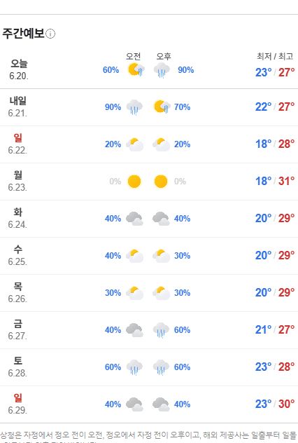 먼저 6월 20일 아침에 나온 일간, 주간 예보.