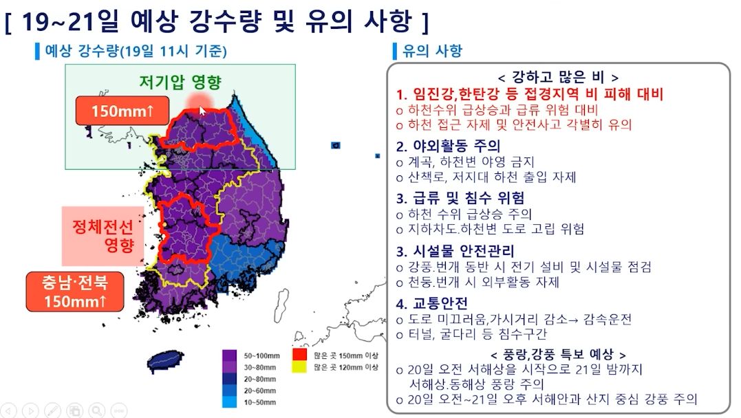 (19일 기상해설 및 이번 비의 배경 설명 - 기압골 등 - 분량은 생략. 영상을 보세요.)