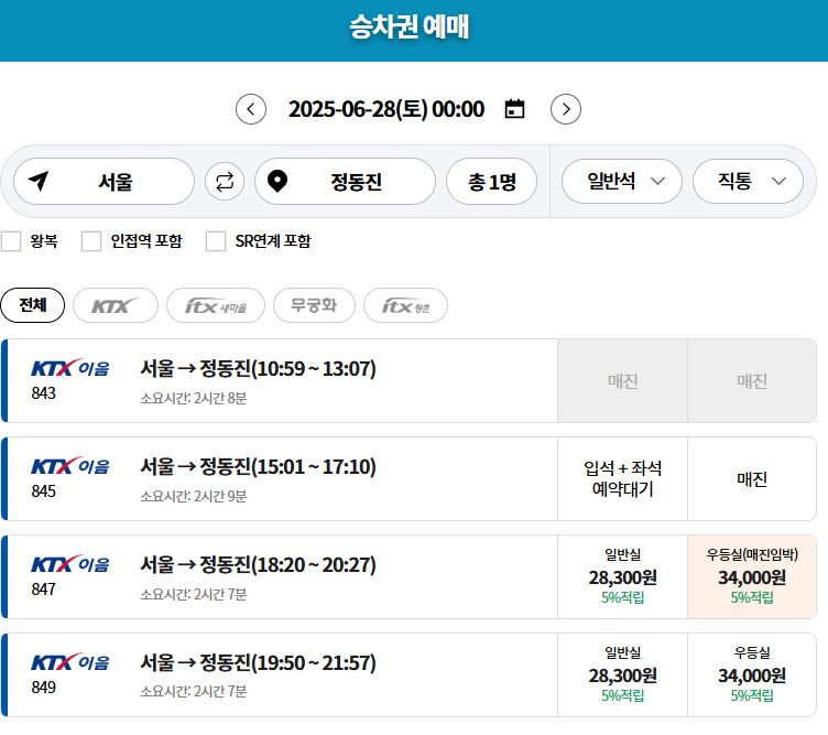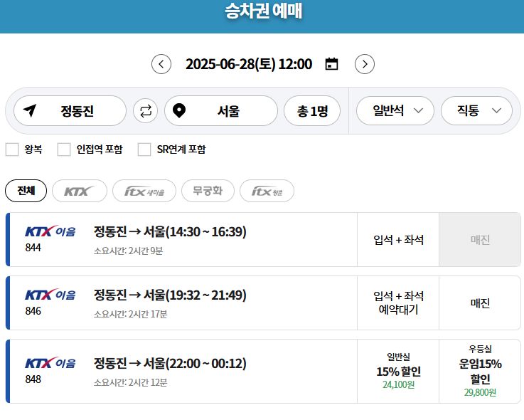 그럼 코레일에서 직접 검색해보죠. 정동진은 정동진역이 있고 꽤 알려져있으니까..