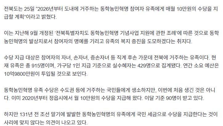 정읍시에 만들어진 동학농민혁명 조형물 [정읍시청 홈페이지] 전북도가 동학농민혁명 유족에게 수당을 지급하기로 하면서 갑론을박이 일고 있다. 전북도는 25일 “2026년부터 도내에 거주하는